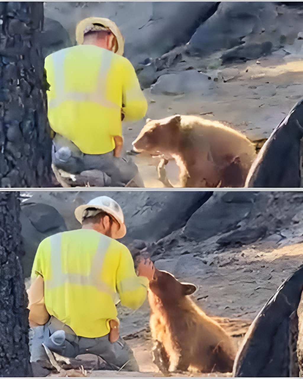 As fate would have it, one day during his compassionate vigil, a wildlife photographer happened upon the scene. From a distance, he captured a poignant image of the logger kneeling, his eyes locked onto the cub as it tentatively nibbled on the food. The photo resonated with viewers, encapsulating raw emotion: a blend of grief, empathy, and unwavering love. The image rapidly circulated online, igniting conversations across social media. Captions flooded in, heralding him as “the logger who fed a starving bear,” symbolizing a rare beacon of hope amid a world often overshadowed by conflict and cruelty.
